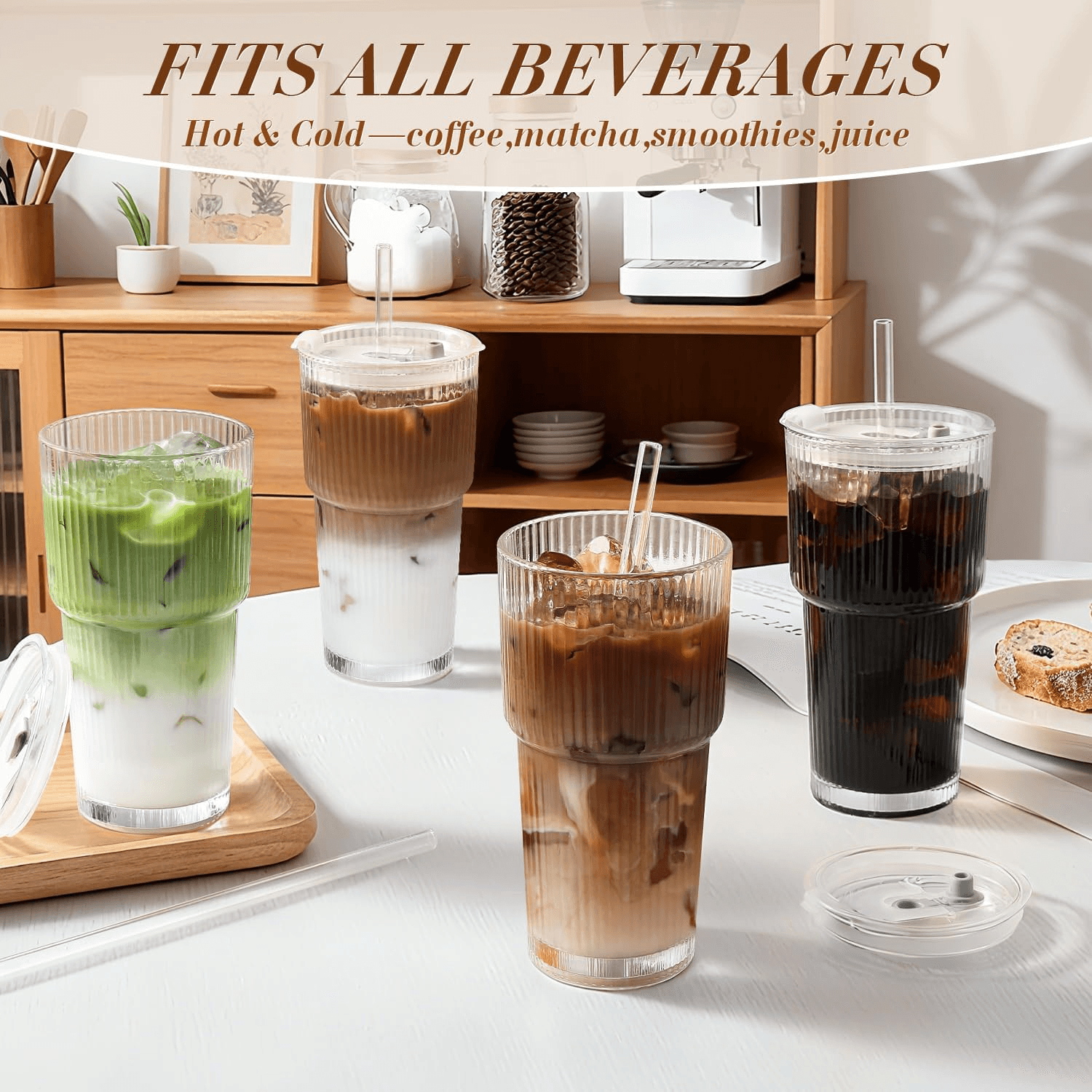 Ribbed Glass Tumbler with Straw and Lid 4Pcs